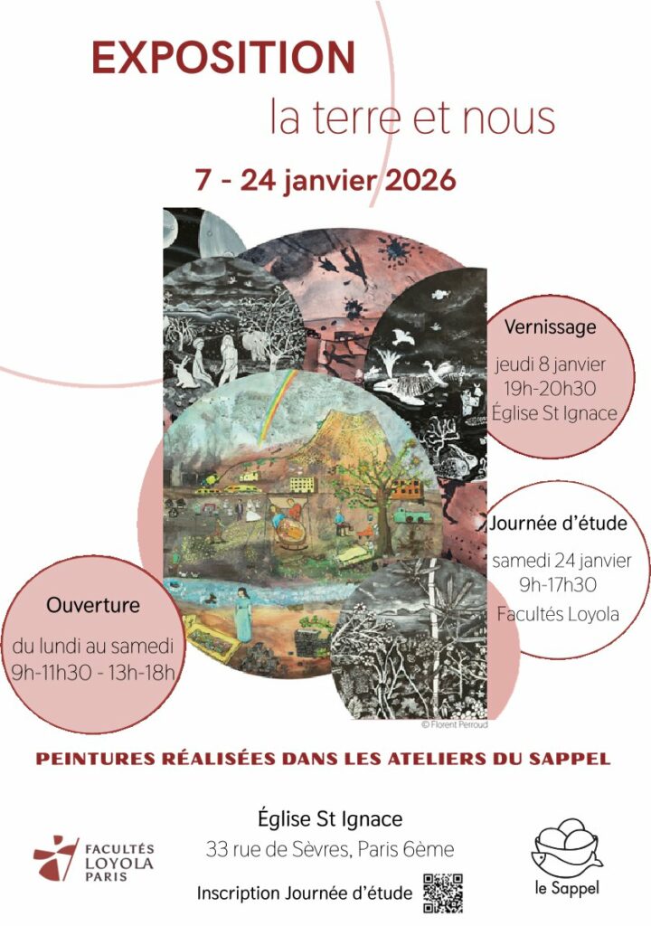Du 7 au 14 janvier à St Ignace, Exposition La terre et Nous. Des peintures réalisées dans les ateliers du SAPPEL représentent les 7 jours de la création avec un 8ème et 9ème jour. .